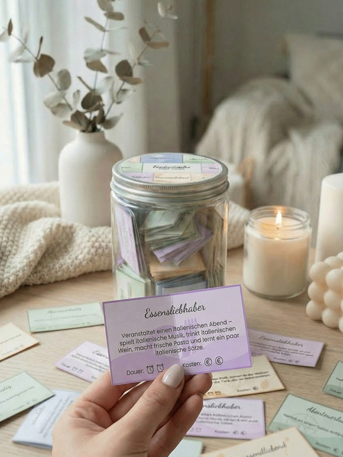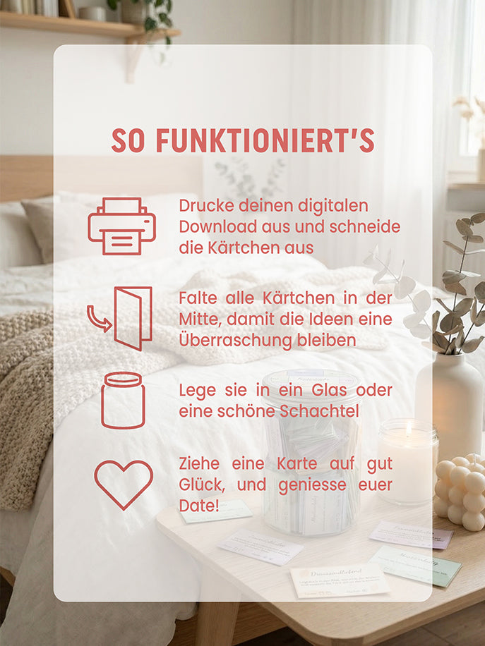 Bestelle, lade die PDFs herunter, drucke sie aus und folge den Anweisungen. Fertig – sofortiger Date-Night-Spaß!
