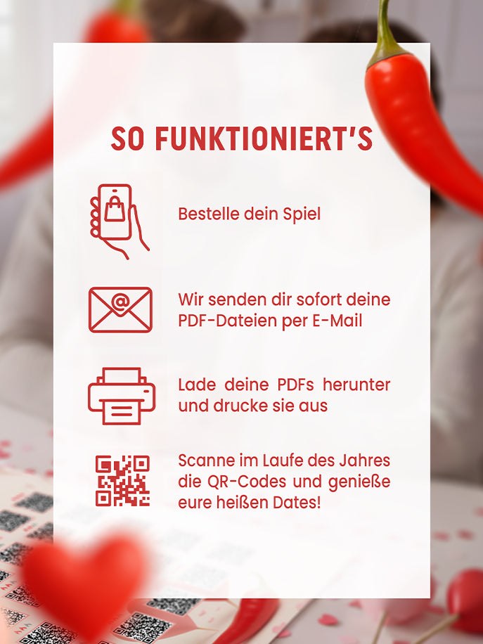 Bestelle, lade die PDFs herunter, drucke sie aus und folge den Anweisungen. Fertig – sofortiger Date-Night-Spaß!
